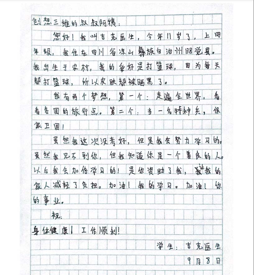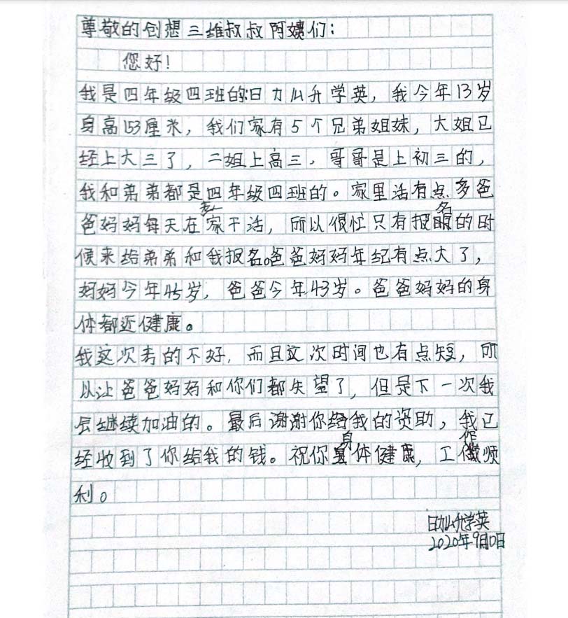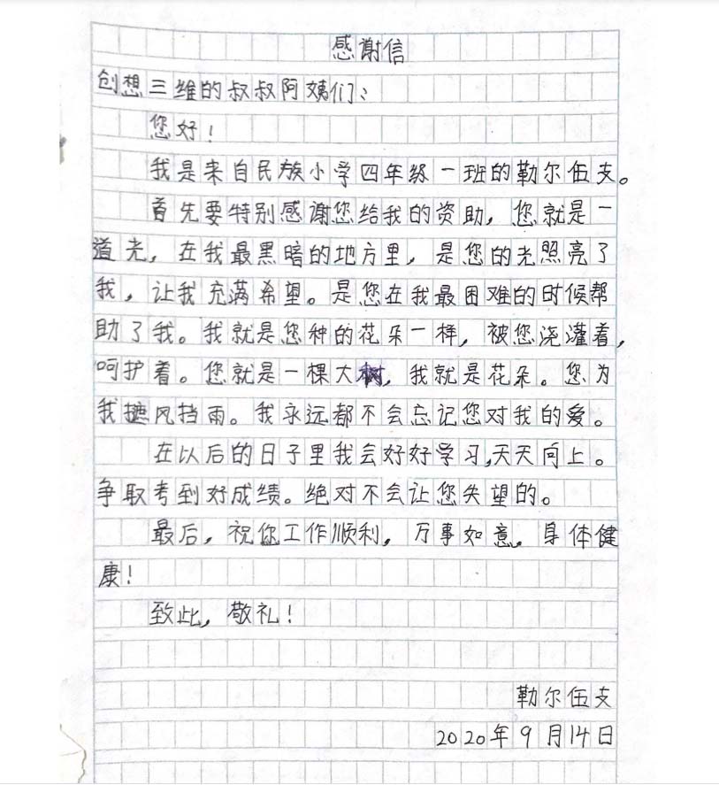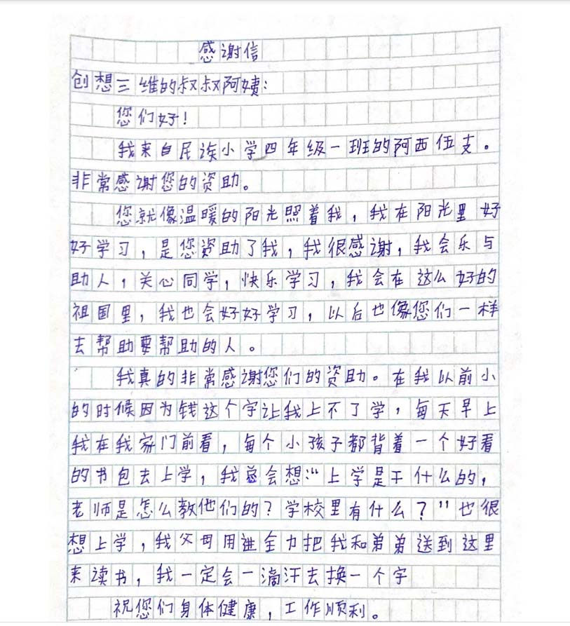 近幾天,我們也陸續(xù)收到孩子們寫來的感謝信。相信這份外化為實(shí)際行動(dòng)的愛心能夠點(diǎn)燃孩子心中的希望,鼓勵(lì)他們用學(xué)習(xí)改變命運(yùn),同時(shí)也激勵(lì)其他同學(xué)更加努力奮進(jìn)。