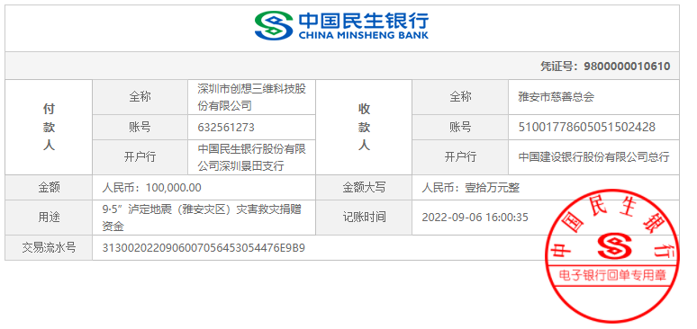 昨日發(fā)生在四川瀘定的地震牽動著全國人民的心。為支持當(dāng)?shù)乜拐鹁葹?zāi),深圳市創(chuàng)想三維科技股份有限公司向雅安市慈善總會捐贈10萬元,作為“9.5瀘定地震”災(zāi)害救災(zāi)專項(xiàng)資金。
