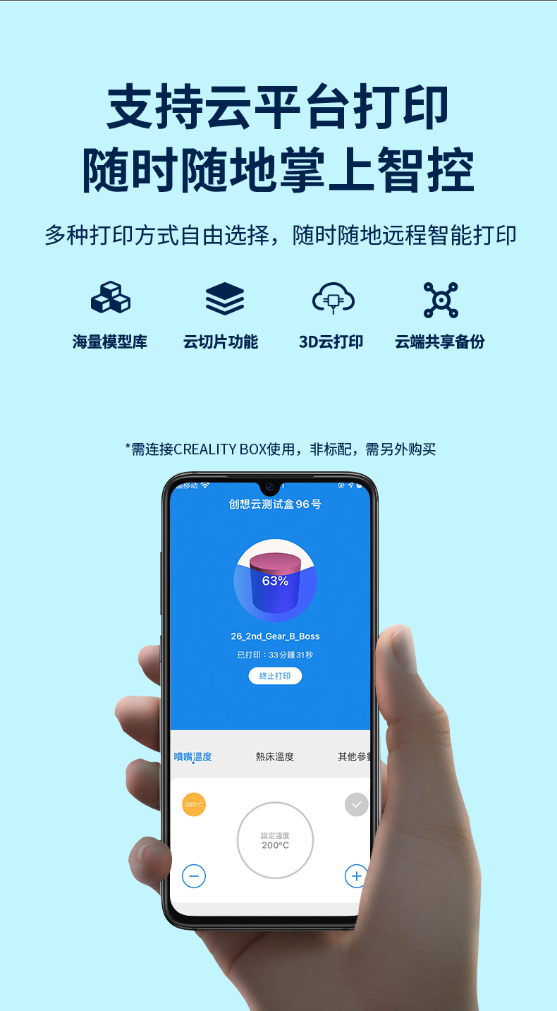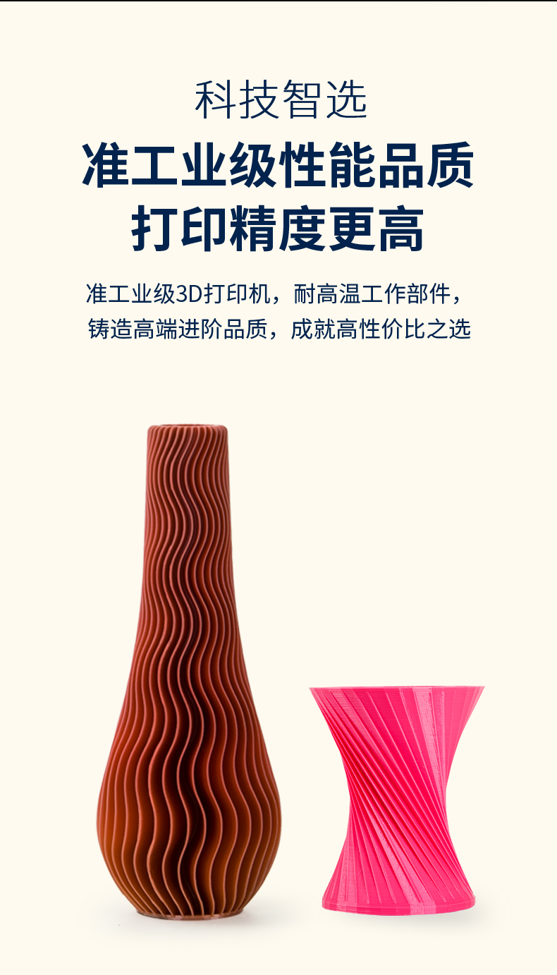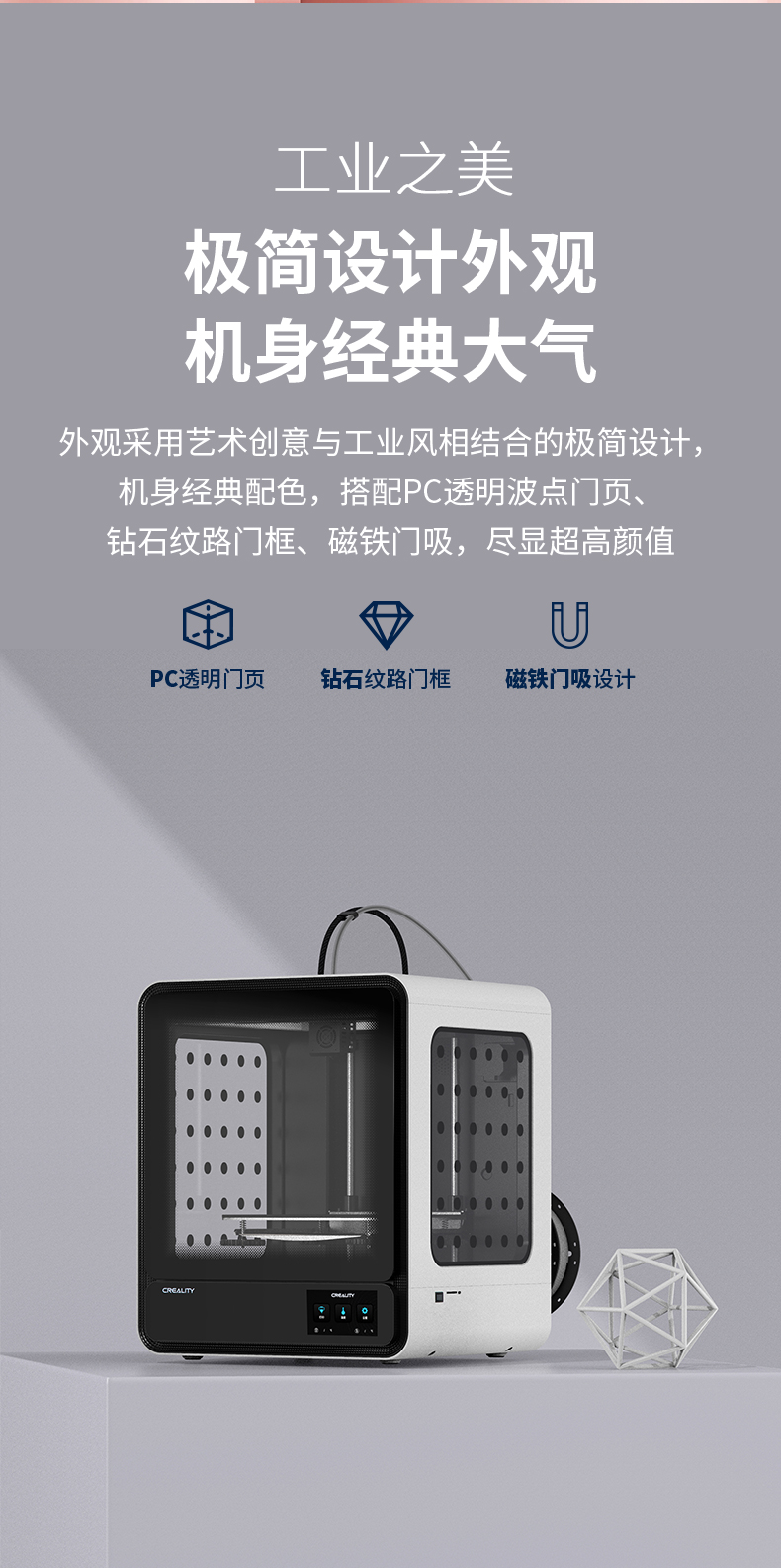 一臺顏值與實力并存的機器,全封閉式機箱,可打高溫耗材。200*200*200mm的打印尺寸。支持云平臺打印,隨時掌上智控。攜帶斷料檢測,且能超靜音打印。
