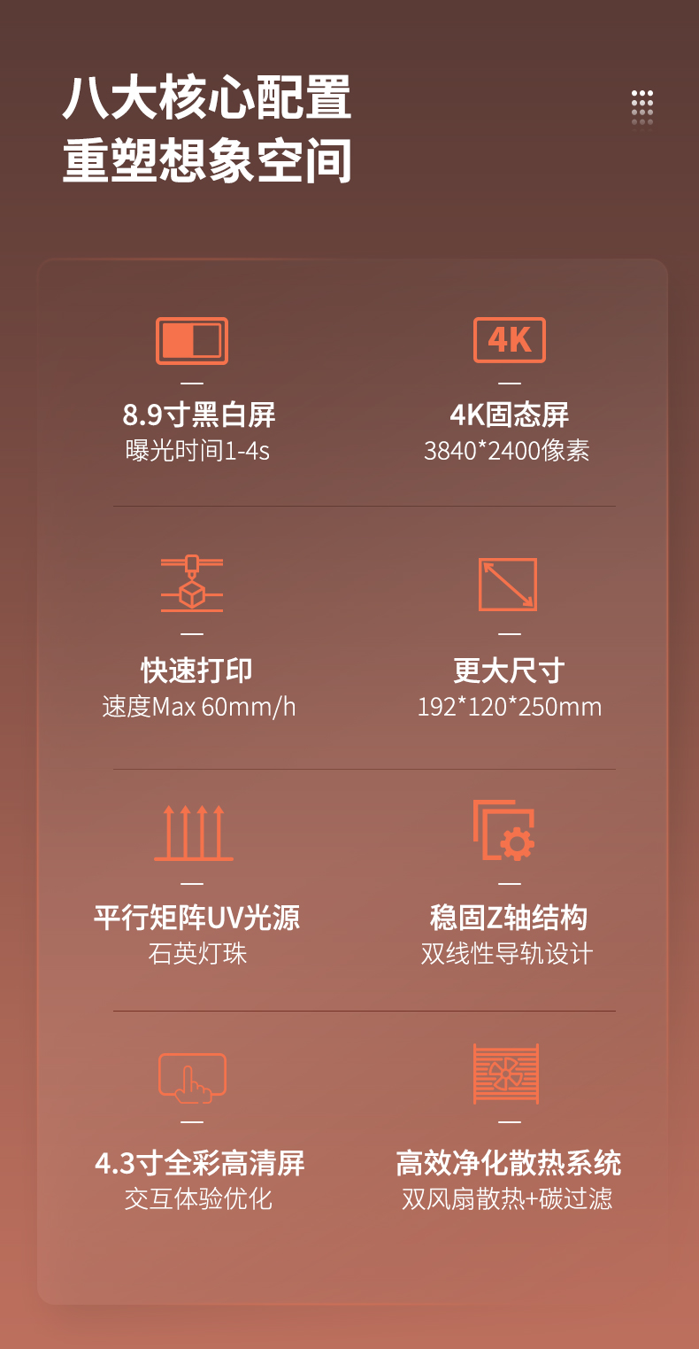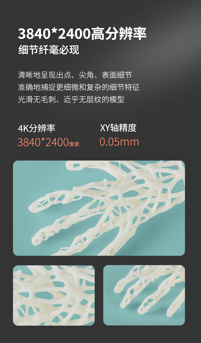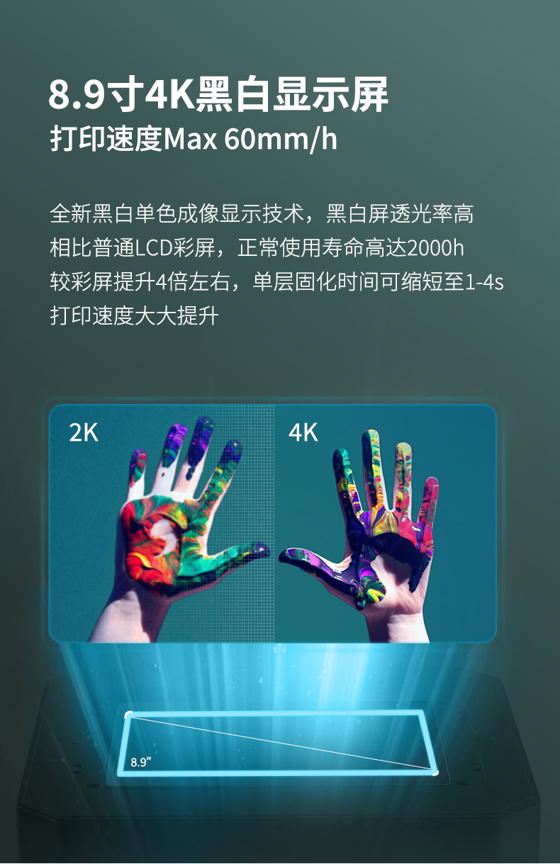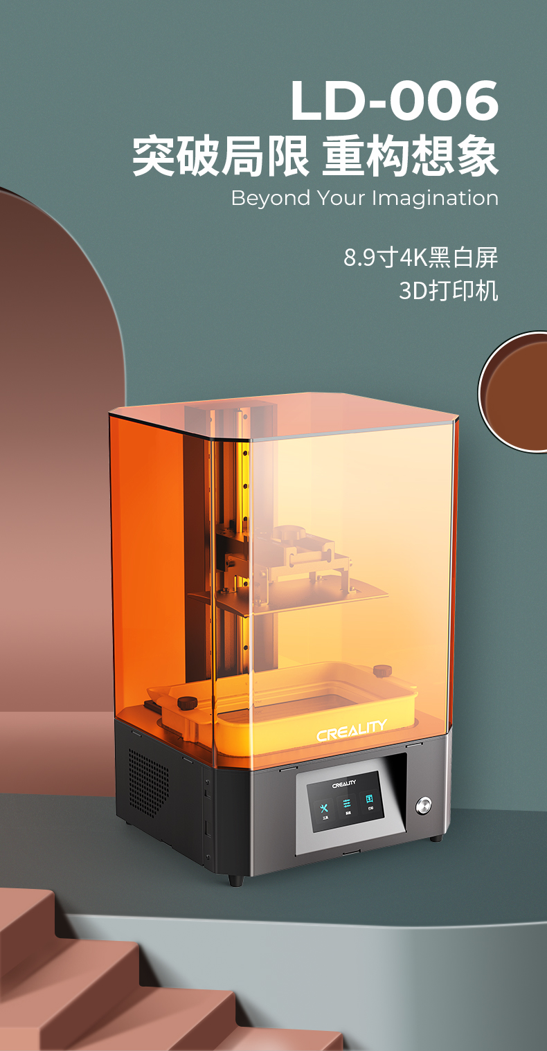 LD-006光固化3D打印機,擁有8.9寸4K黑白顯示屏,打印速度60mm/h,3840*2400高分辨率,192*120*250mm打印尺寸,內(nèi)置空氣凈化系統(tǒng),人性化創(chuàng)新料槽,噴砂成型平臺。